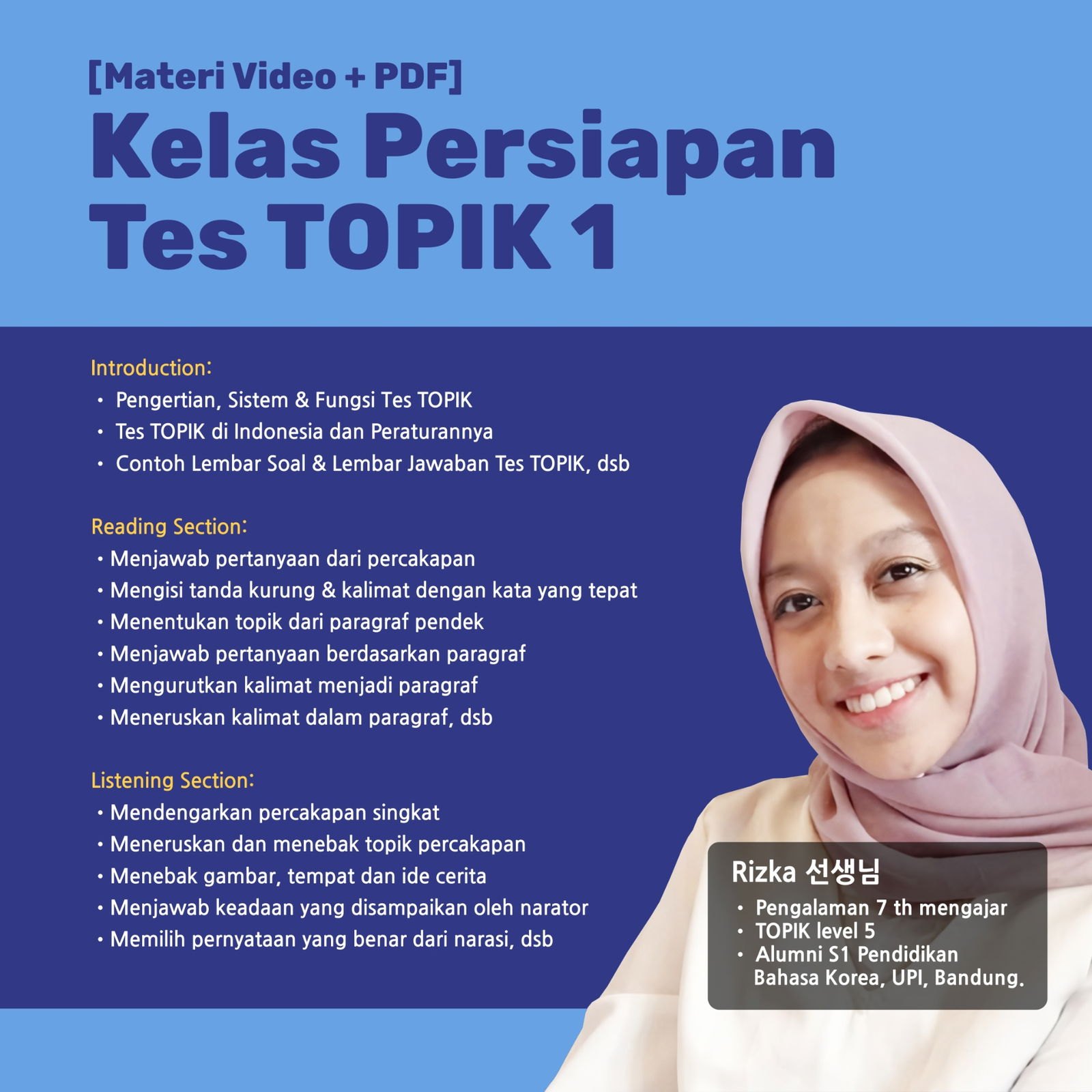 - Fokus mempelajari 2 skill yang diujikan: Reading (읽기) dan Listening (듣기)