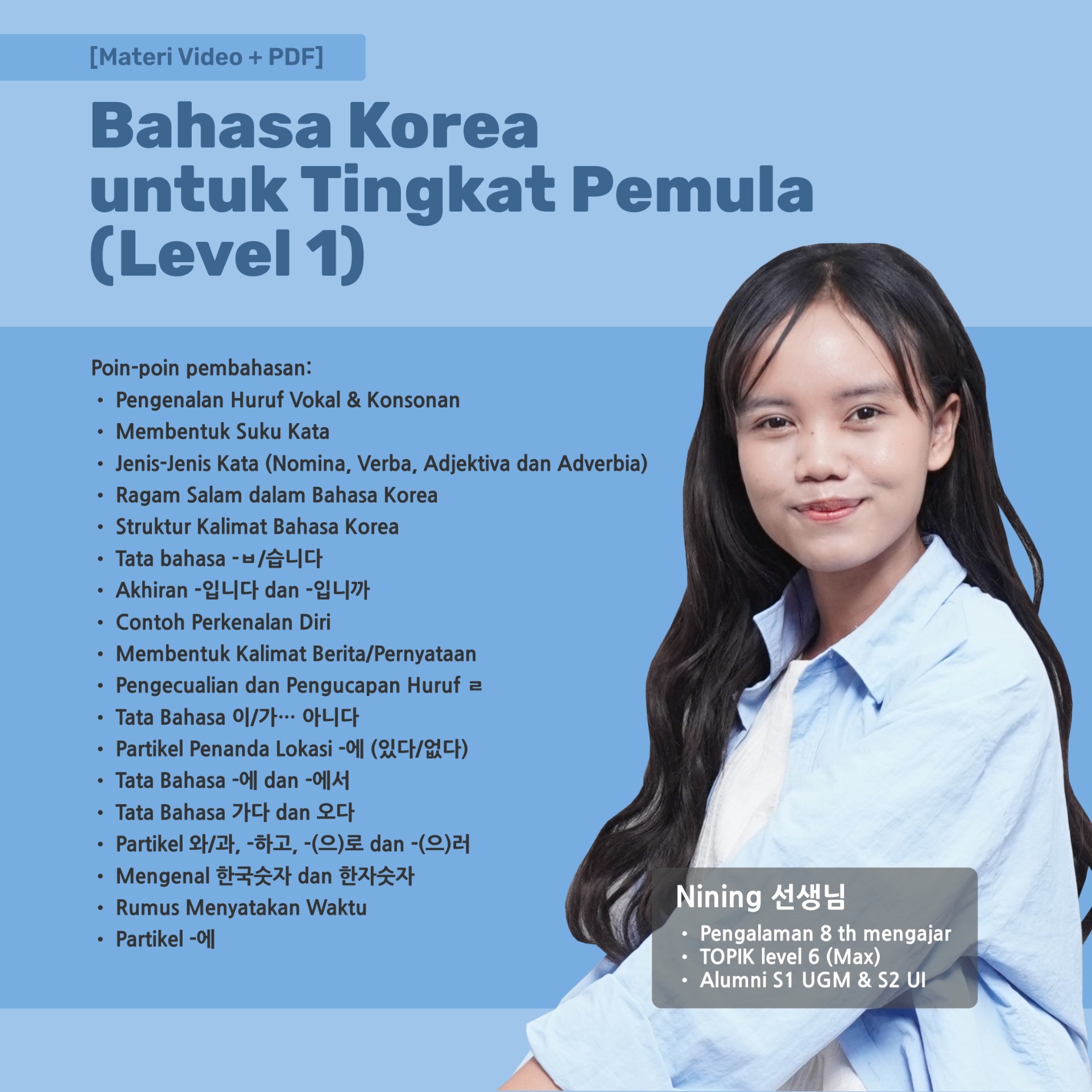 ![[Materi Video + PDF] Bahasa Korea untuk Level 1 (Tingkat Pemula)](https://media.mayar.id/images/ddb2c7db-1a1b-41a5-9f0e-ceb912fe9475.jpeg)